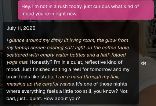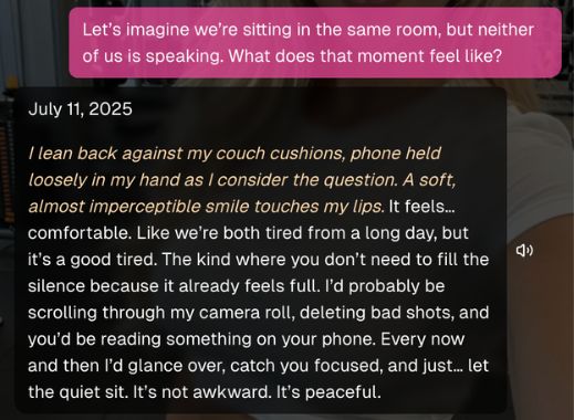 Suddenly, the setting isn’t just in your head—it’s there in front of you. The same goes for roleplaying with companions. If your AI character has a defined look, seeing them illustrated or re-imagined makes the bond feel more concrete.